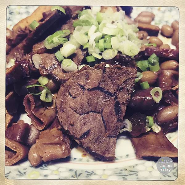 這盤裡頭有牛肉、牛筋、牛肚、土豆、大腸、豆干,灑了一把青花香噴噴
