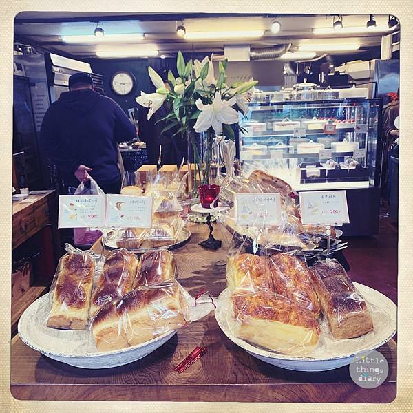 長桌上擺滿當天出爐的麵包,中間還有一大束的香水百合,擺設超級用心